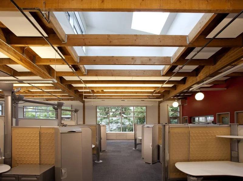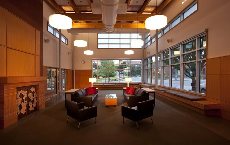 The Advancement & Alumni Building is Seattle University’s campus entry & the University’s symbolic & actual front door. Within 11,360 square feet, the building houses advancement & alumni relations offices, two art galleries, several meeting rooms, and a large meeting space designed to be the university’s living room. The project creates a forward-looking professional environment that supports workplace productivity and effectiveness, creates a genuine University connection to the neighborhood, and strengthens the Seattle University campus experience. An addition and full remodel to a 1970s warehouse structure, this sustainable building incorporates extensive daylighting, raised floor mechanical and technology distribution, low VOC finishes, rainwater collection and irrigation, verdant low-impact landscaping, and rooftop gardens and photovoltaic panels. The project achieved a LEED Gold rating from the United States Green Building Council.