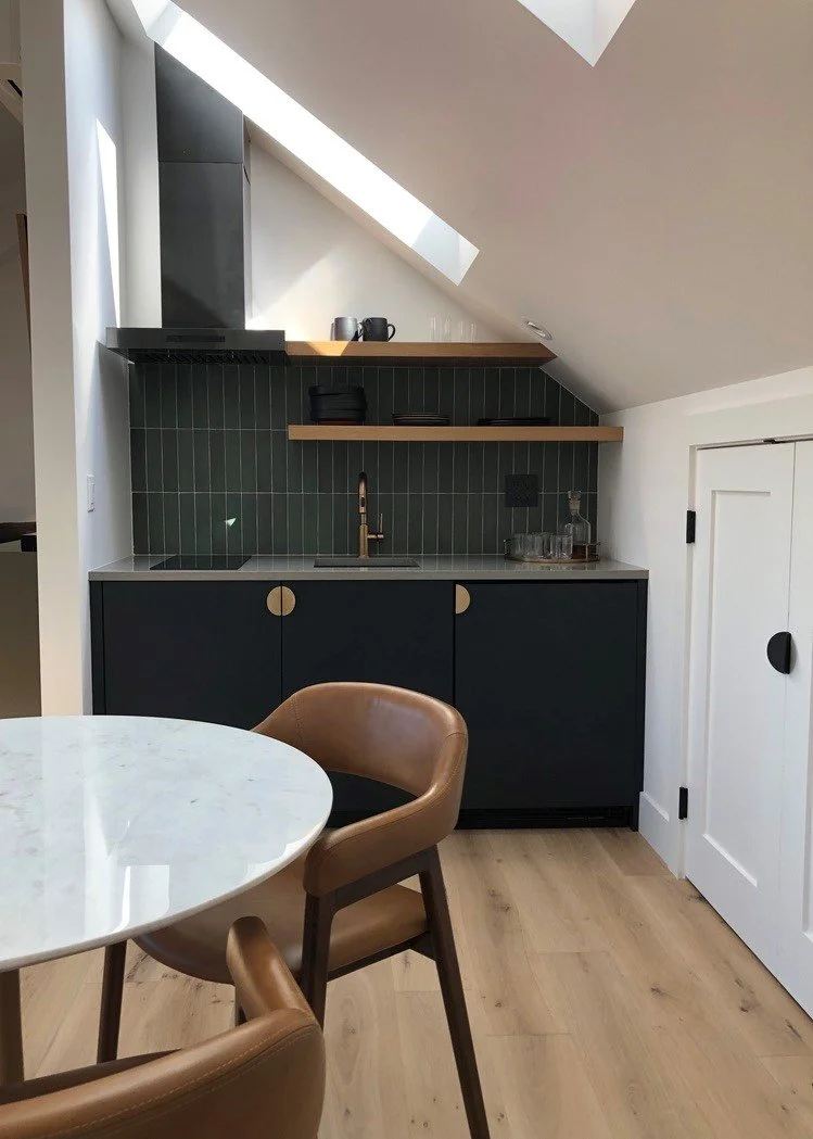 This Detached Accessory Dwelling Unit (DADU) is built on top of an existing alley garage, & designed to blend with the existing house. Cardinal created flexible spaces with spiral stairs, skylights, large windows & dormers, & hidden storage.