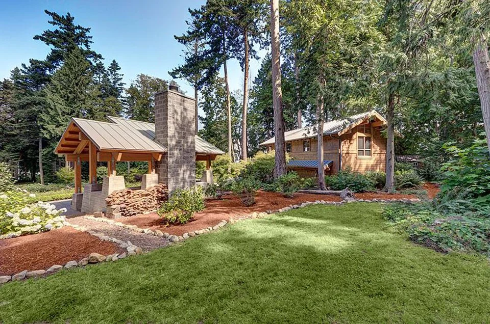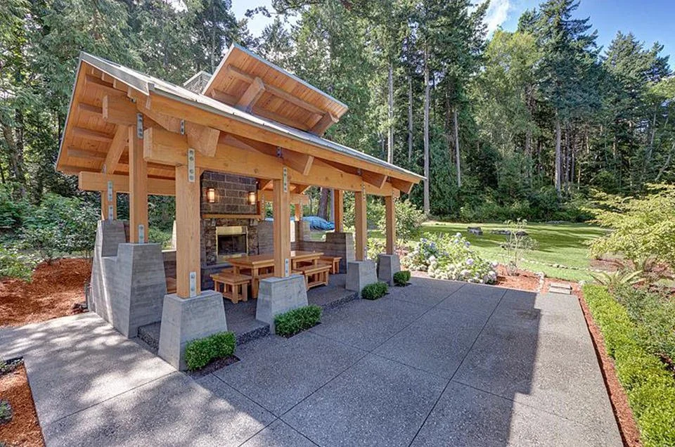 Cardinal Architecture designed this unique outdoor pavilion with Douglas fir timber thinned from the adjacent forest. Inspired by Northwest Civilian Concervation Corps projects of the 1930s, the structure opens to a meadow & creates a comfortable spot to enjoy all four Northwest seasons. The design includes board-formed concrete, clear finished fir, galvanized steel connectors, & standing seam steel roofing. Site-built, custom fir furniture & a wood-burning fireplace complete the rustic experience.