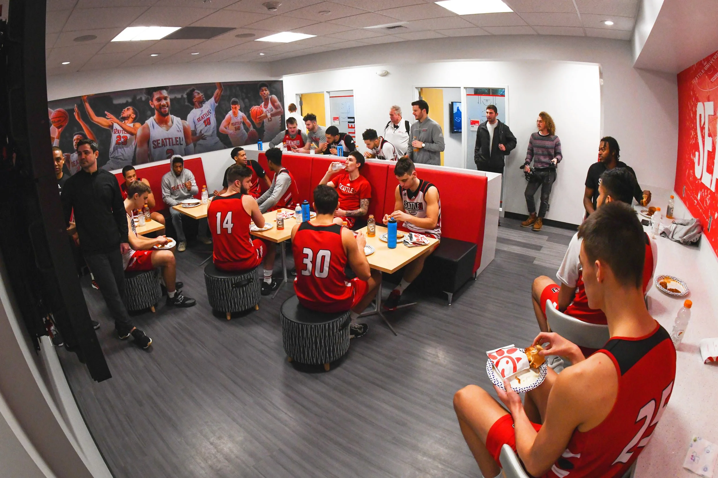 The Seattle University Men’s Basketball team wanted an office suite that functioned like an impressive family room. Their renovated home is where the Redhawks study, dine, socialize & strategize. Cardinal designed a complete renovation of their existing offices that accommodates team meals, study groups, film sessions & coach’s offices. The team was excited to see the changes, & see the team’s reaction to the new space in the reveal video here.